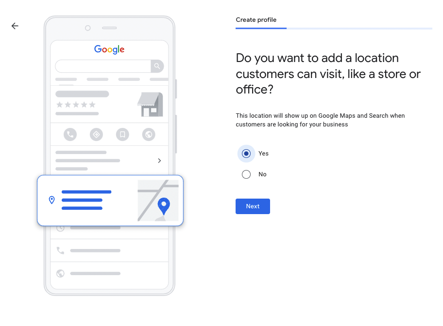 Choose ‘Yes’ to indicate you have a physical location; click ‘Next.’