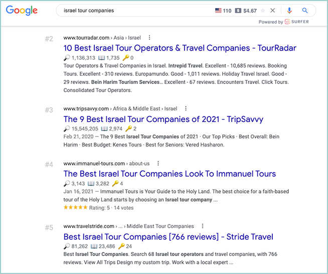 Immanuel Tours went from unranked to position 4 for “israel tour companies,” from position 17 to 2 for “christian tours to israel,” and, from position 9 to 1 for “catholic holy land tours.”